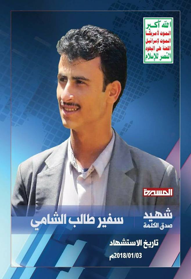 حيث استشهد الزميل سفير الشامي في مديرية خب والشعف بمحافظة الجوف بغارة لطيران العدوان وهو يودي واجبهة بكيمراتة الاعلامية في توثيق لانتصار الجيش واللجان الشعبية ضد العدوان ومنافقية وكشف وتوضيحها للعالم .