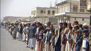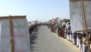 الجوف:وقفه لأبناء مديريتي الحميدات والمراشي وأبناء وادي سفيان تنديدا بالمجازرة التي ارتكبها طيران العدوان في المصلوب