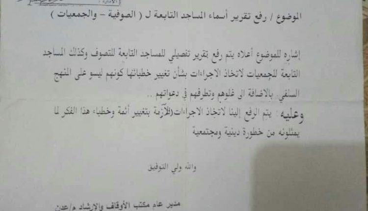 كما أكدت الوثيقة الموجهة من قبل مدير عام مكتب وزارة الأوقاف بعدن محمد حسين الوالي المحسوب على حكومة المرتزقة  ، في منتصف يوليو 2016، إلى مدراء مكاتب الأوقاف في مديريات عدن ، التشديد بالرفع بهوية كل خطيب من خطباء المساجد في المدينة “الصوفيين والتابعيين للجمعيات” إليه ، بتهمة التطرف والإرهاب ليتم اقالتهم.