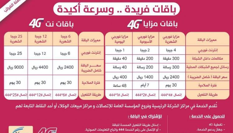 وأوضحت الشركة في بيان تلقته وكالة الأنباء اليمنية (سبأ) أن الباقات شملت مميزات متعددة، منها باقة مزايا الفور جي الشهرية بأربعة جيجا إنترنت و300 دقيقة اتصال و300 رسالة بقيمة 2400 ريال.
