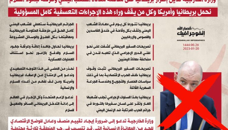 أدانت وزارة الخارجية بالجمهورية اليمنية، الموقف الإجرامي لحكومة المملكة المتحدة، تجاه الشعب اليمني وعرقلة جهود السلام.
