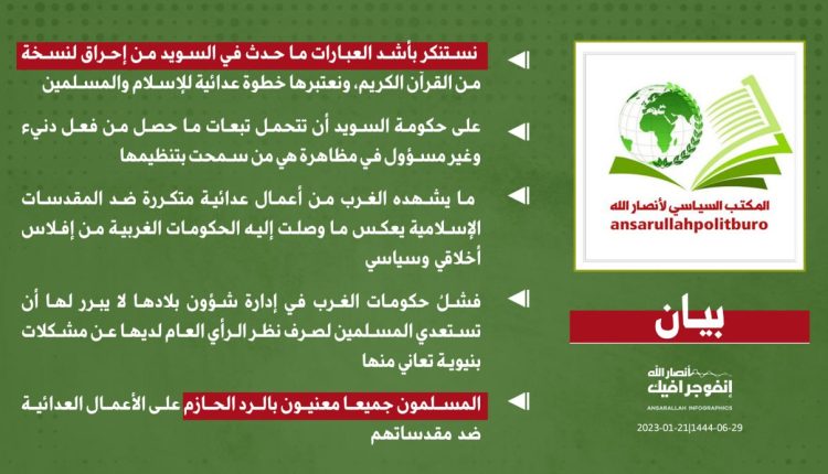 عاجل : المكتب السياسي ل # أنصار الله يستنكر باشد العبارات من احراق لنسخة من القرآن الكريم في سويد