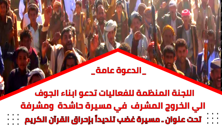 اللجنة المنظمة للفعاليات بمحافظة الجوف تدعو الي الخروج الحاشد صباح الاربعاء تنديد باحراق نسخة من كتاب الله