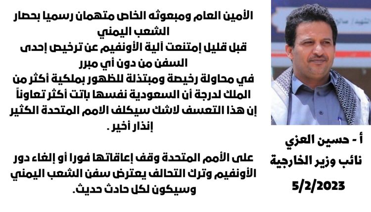 نائب وزير الخارجية حسين العزي : الأمم المتحدة تبرر عرقلة السفينة angelina بعدم تلقي الآلية الأممية الضوء الاخضر من الرياض للقيام بالتفتيش