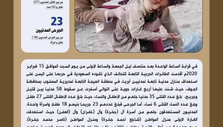 #حدث_في_مثل_هذا_اليوم_بتاريخ 15-2-2020م #جريمة_استهداف_منازل_المدنيين_في_منطقة_الهيجة محافظة الجوف – مديرية المصلوب #الذكرى_الثالثة في قرابة الساعة الواحدة بعد منتصف ليل الجمعة والساعة الأولى من يوم السبت الموافق 15 فبراير 2020م أقدمت الطائرات الحربية التابعة للتحالف الذي تقوده السعودية في حربها على اليمن على استهداف منازل مدنية تابعة لمدنيين أبرياء في منطقة الهيجة التابعة لمديرية المصلوب بمحافظة الجوف، حيث شنت عليها أربع غارات جوية على التوالي أسفرت عن سقوط 58 مدنيا بين قتيل وجريح،  بلغ عدد القتلى 35 مدنيا جلهم من الأطفال والنساء، حيث بلغ عدد الأطفال القتلى 27 طفل وبلغ عدد النساء القتلى 6 نساء. أما الجرحى فبلغ عددهم 23 جريحا بنيهم 18 طفلا وامرأة واحدة. المدنيون المستهدفون جلهم من أسرة آل (جخرة) وآل (خفران) وآل (العفن) حيث استهدفت الغارة الأولى منزل المواطن (شاجع احمد جخرة) ومنزل المواطن (ناصر محمد جخرة). هرع بعدها إليهم أهالي القرية محاولين إنقاذهم لكن طائرات التحالف السعودي الحربية عاودت استهداف المكان بغارة ثانية .