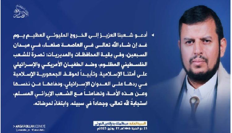 ودعا السيد القائد عبدالملك بدرالدين الحوثي شعبنا العزيز إلى الخروج المليوني العظيم يوم غد إن شاء الله تعالى في العاصمة صنعاء، في ميدان السبعين، وفي بقية المحافظات والمديريات نصرةً للشعب الفلسطيني المظلوم، وضد الطغيان الأمريكي والإسرائيلي على أمتنا الإسلامية، وتأييداً لموقف الجمهورية الإسلامية في ردها على العدوان الإسرائيلي، ودفاعها عن نفسها وعن هذه الأمة، وتضامناً مع الشعب الإيراني المسلم، استجابةً لله تعالى، وجهاداً في سبيله، وابتغاءً لمرضاته.