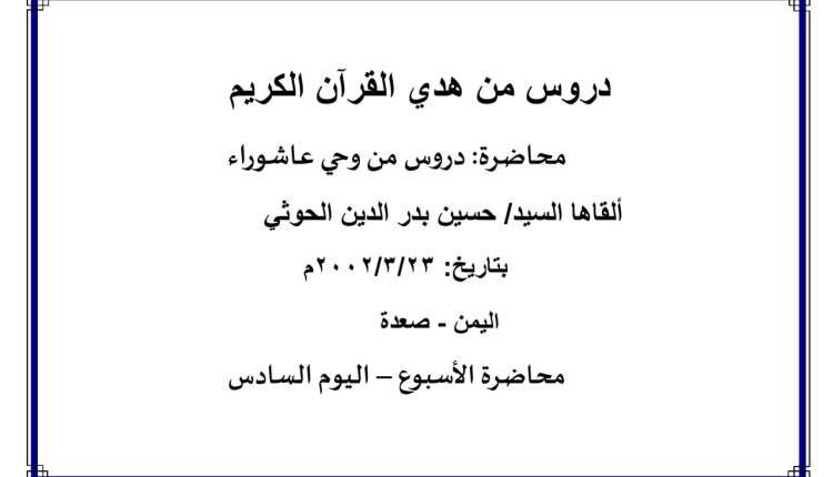 محاضرة : دروس من وحي عاشوراء: من الصفحة ( 15 ) إلى الصفحة ( 18 ) … من قوله:(نحن نقول: إن من نعم الله العظيمة علينا هو القرآن الكريم،) إلى:(نهاية المحاضرة )