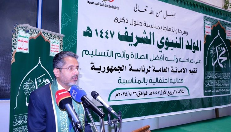 وخلال الفعالية، أكد أمين عام رئاسة الجمهورية حسن شرف الدين أن إحياء هذه الذكرى ليس للاحتفال فحسب، بل هو محطة للتأمل والاقتداء بسيرة النبي الأعظم، مشيراً إلى أن الشعب اليمني يجسد اليوم قيم النصرة والدفاع عن قضايا الأمة، وفي مقدمتها القضية الفلسطينية، رغم ما يعيشه من عدوان وحصار.