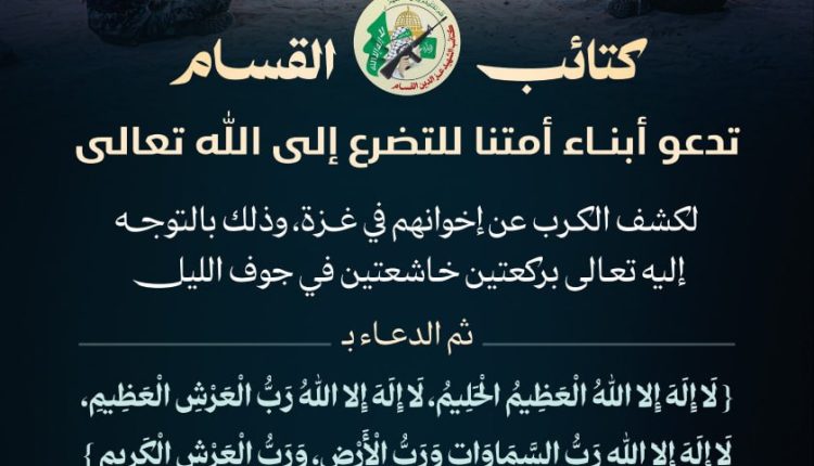 دعت كتائب الشهيد عز الدين القسام أبناء الأمة الإسلامية إلى التضرع إلى الله تعالى وطلب الفرج لأهل غزة، وذلك عبر أداء ركعتين خاشعتين في جوف الليل ثم ترديد الدعاء: