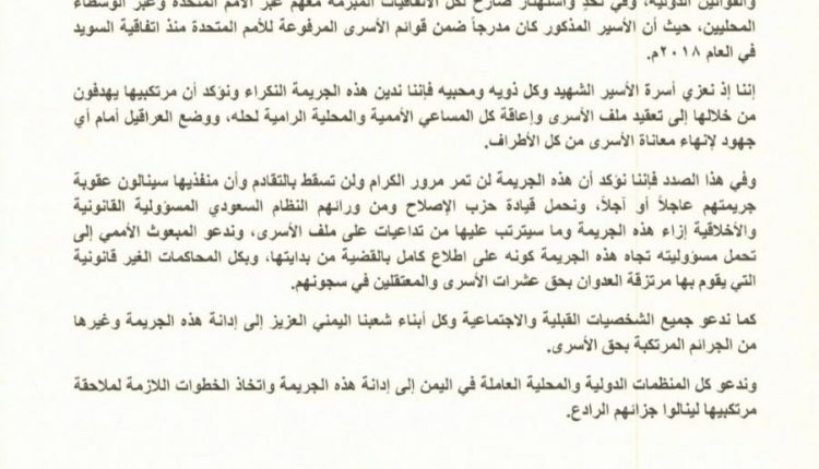 وعبرت اللجنة عن تعازيها لأسرة الأسير وذويه، مؤكدة أن مرتكبي هذه الجريمة يسعون إلى تعقيد ملف الأسرى وإعاقة الجهود الأممية والمحلية لإنهاء معاناتهم. وأكدت أن هذه الجريمة لن تمر دون محاسبة، وأن منفذيها سيواجهون عقوبة جريمتهم عاجلاً أو آجلاً، محملة قيادة حزب الإصلاح والنظام السعودي المسؤولية القانونية والأخلاقية.