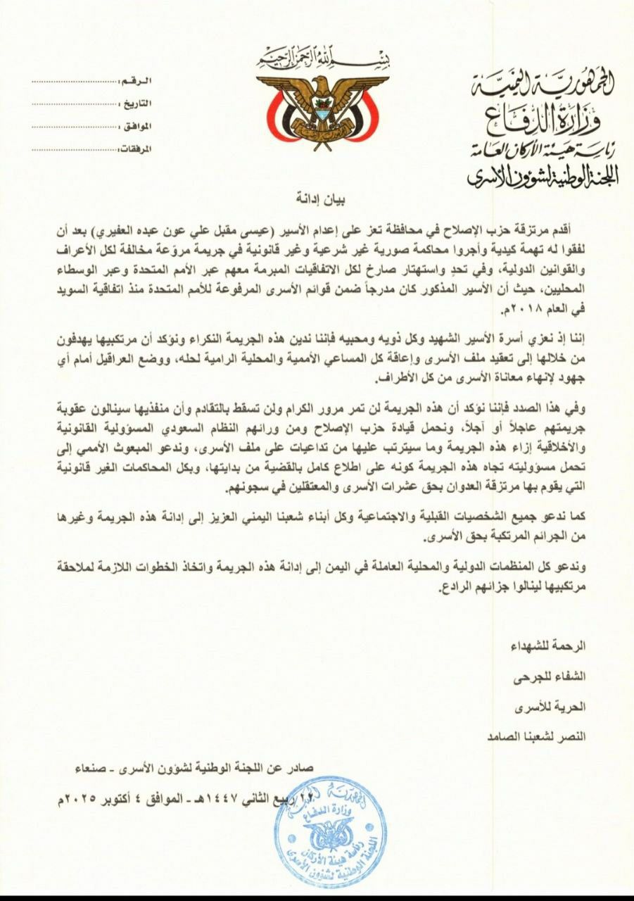 أدانت اللجنة الوطنية لشؤون الأسرى إقدام مرتزقة حزب الإصلاح في تعز على إعدام الأسير عيسى مقبل علي عون العفيري بعد توجيه تهم كيدية له وإجراء محاكمة صورية وغير قانونية.