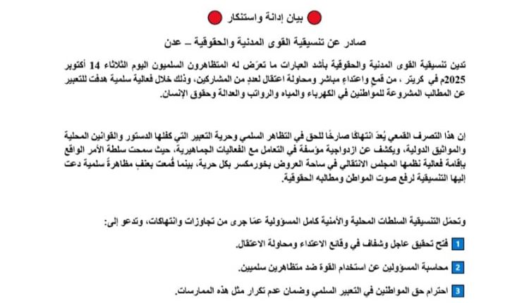 وفي بيان لها، أدانت “تنسيقية القوى المدنية والحقوقية” في عدن الاعتداء الذي استهدف المشاركين في التظاهرة، واعتبرته “انتهاكًا صارخًا لحق المواطنين في التظاهر السلمي وحرية التعبير”.