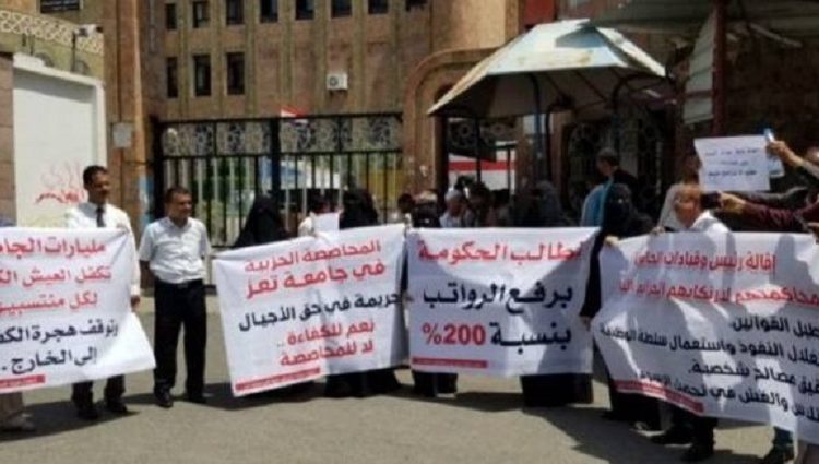 نظم أعضاء هيئة التدريس والأكاديميون في جامعة تعز، الخاضعة لسيطرة فصائل التحالف، اليوم الخميس، وقفة احتجاجية حاشدة، للمطالبة بصرف مستحقاتهم المالية المتأخرة لأكثر من أربعة أشهر، وسط أوضاع معيشية واقتصادية صعبة تهدد حياتهم اليومية.