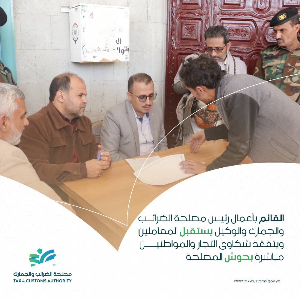 في إطار تعزيز مبدأ الشفافية وتسهيل الإجراءات وتحسين مستوى الخدمات المقدمة، استقبل القائم باعمال رئيس مصلحة الضرائب والجمارك الدكتور إبراهيم علي مهدي ووكيل المصلحة الاستاذ عدنان الغفاري، اليوم، عدداً من المعاملين والتجار والمواطنين، واستمعا إلى شكاويهم وملاحظاتهم بشكل مباشر في حوش المصلحة.