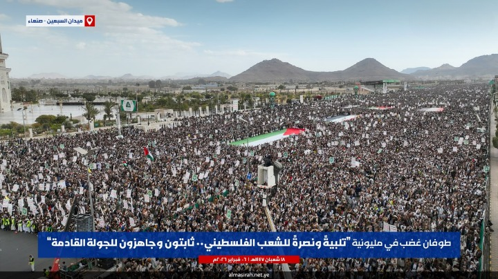 في مشهدٍ استثنائي يختصر وعي الشعب اليمني وثباته، احتشدت الملايين في ميدان السبعين بالعاصمة صنعاء، تلبيةً لنداء فلسطين واستجابةً لدعوة قائد الثورة السيد عبدالملك بدرالدين الحوثي، رافعةً شعار: «تلبيةً ونصرةً للشعب الفلسطيني.. ثابتون وجاهزون للجولة القادمة».. خروجٌ مليونيٌّ أعاد التأكيد على أن اليمن، بقراره الحرّ، حاضرٌ في قلب معركة الأمة، وأن نصرة غزة ليست حدثًا عابرًا، بل موقفًا راسخًا يتجدد مع كل مرحلة.