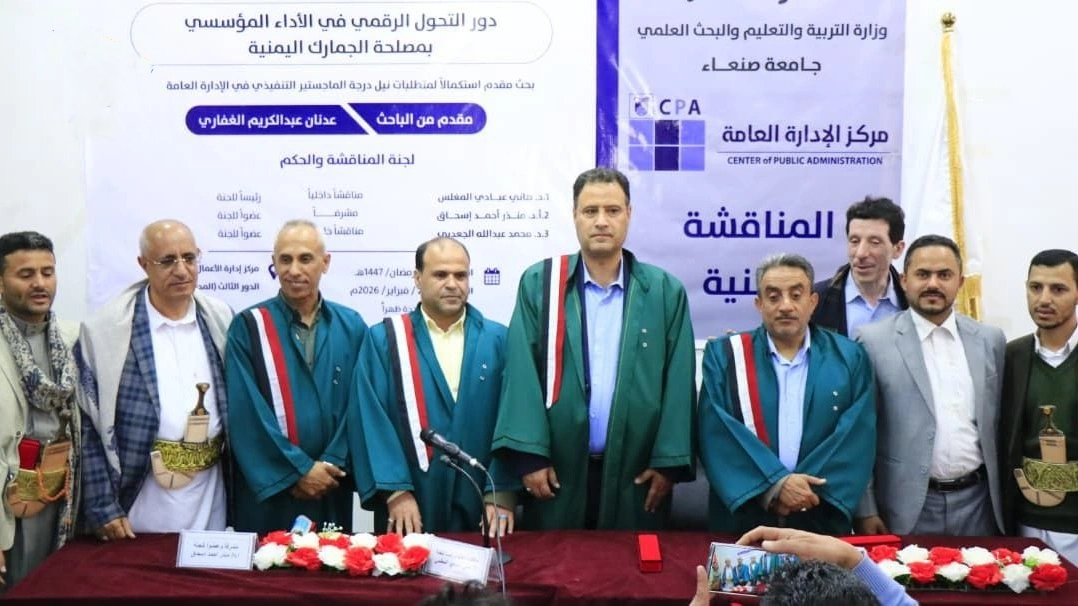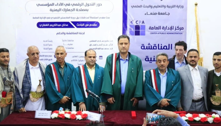 نال الباحث عدنان عبدالكريم الغفاري درجة الماجستير التنفيذي بامتياز في الإدارة العامة من مركز الإدارة العامة بجامعة صنعاء عن رسالته الموسومة بـ “دور التحول الرقمي في الأداء المؤسسي بمصلحة الجمارك”.