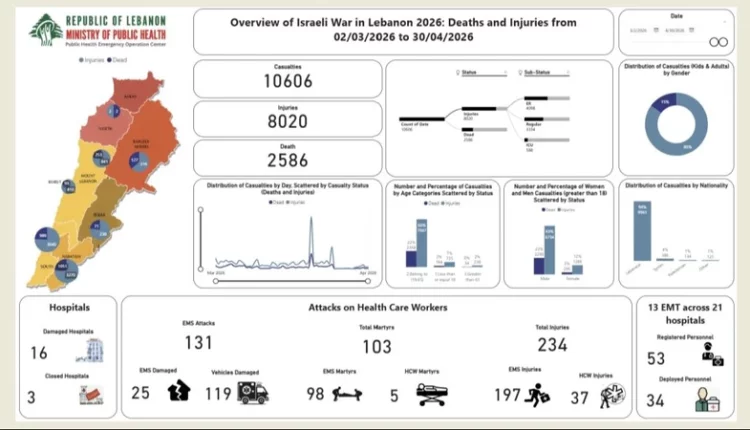 سجّلت حصيلة ضحايا العدوان الإسرائيلي على لبنان ارتفاعاً جديداً، لتصل إلى 2586 شهيداً و8020 جريحاً منذ بدء التصعيد في الثاني من مارس الماضي، في ظل استمرار الهجمات واستهداف المناطق المدنية.
